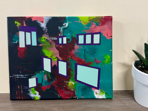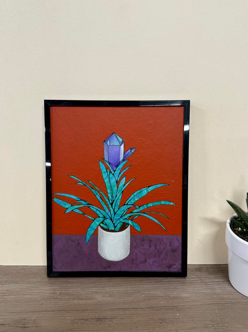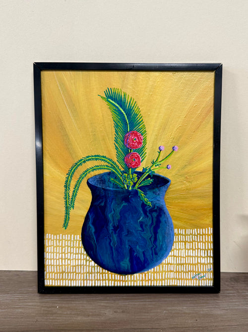Thrown ceramic cylinder with sgraffito and painted underglaze designs. Inside are layered blue glazed for speckled effect.